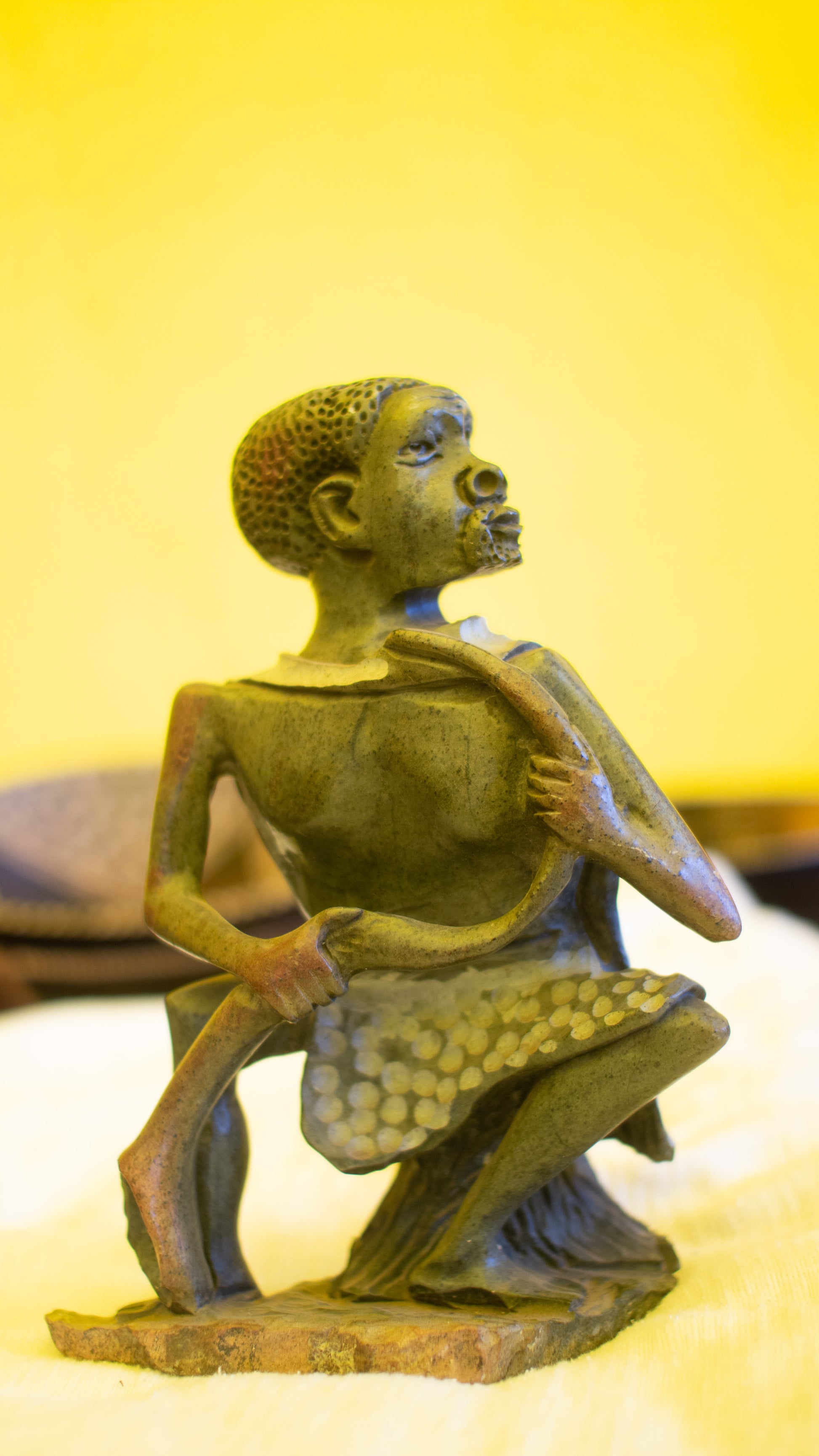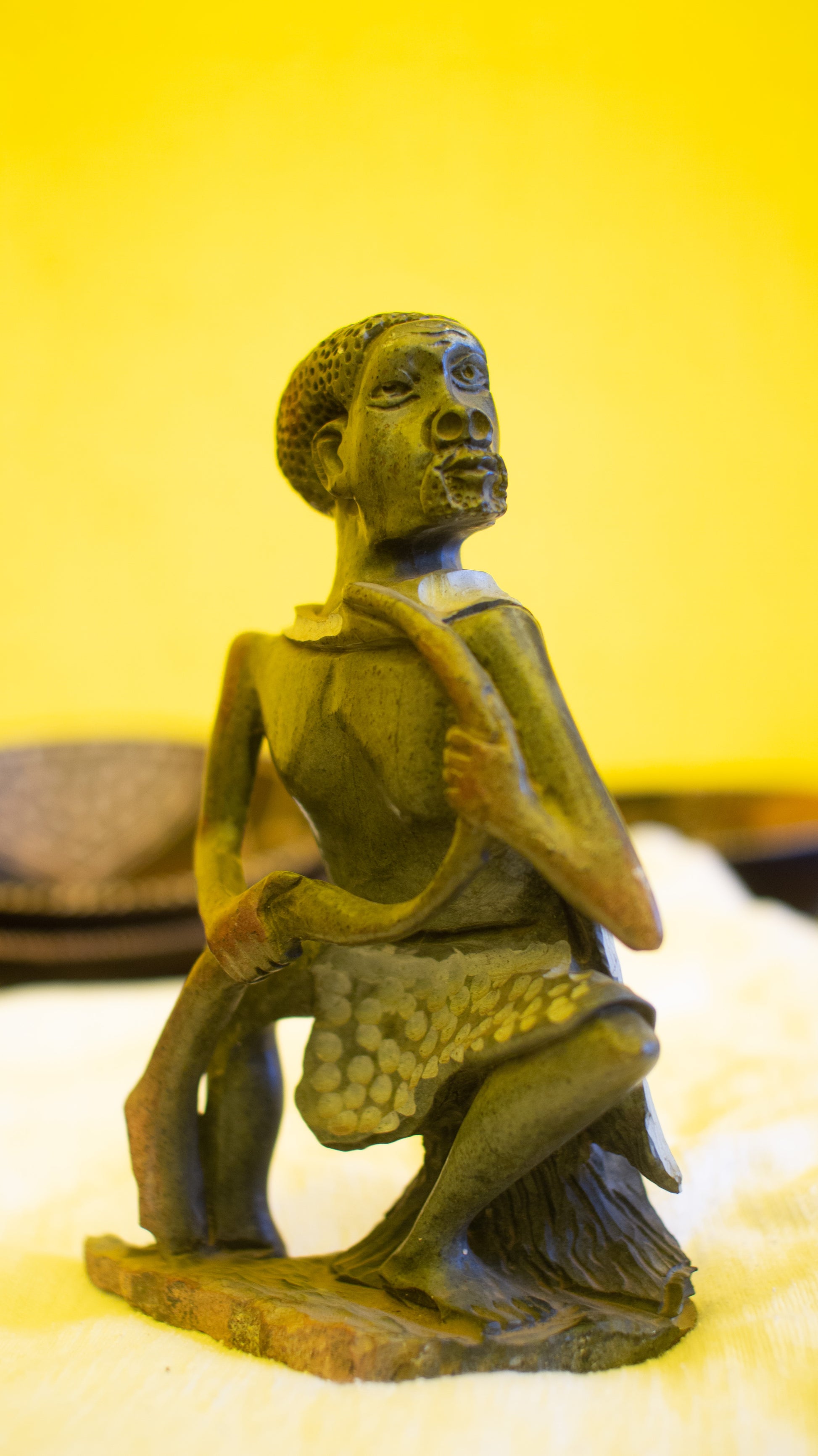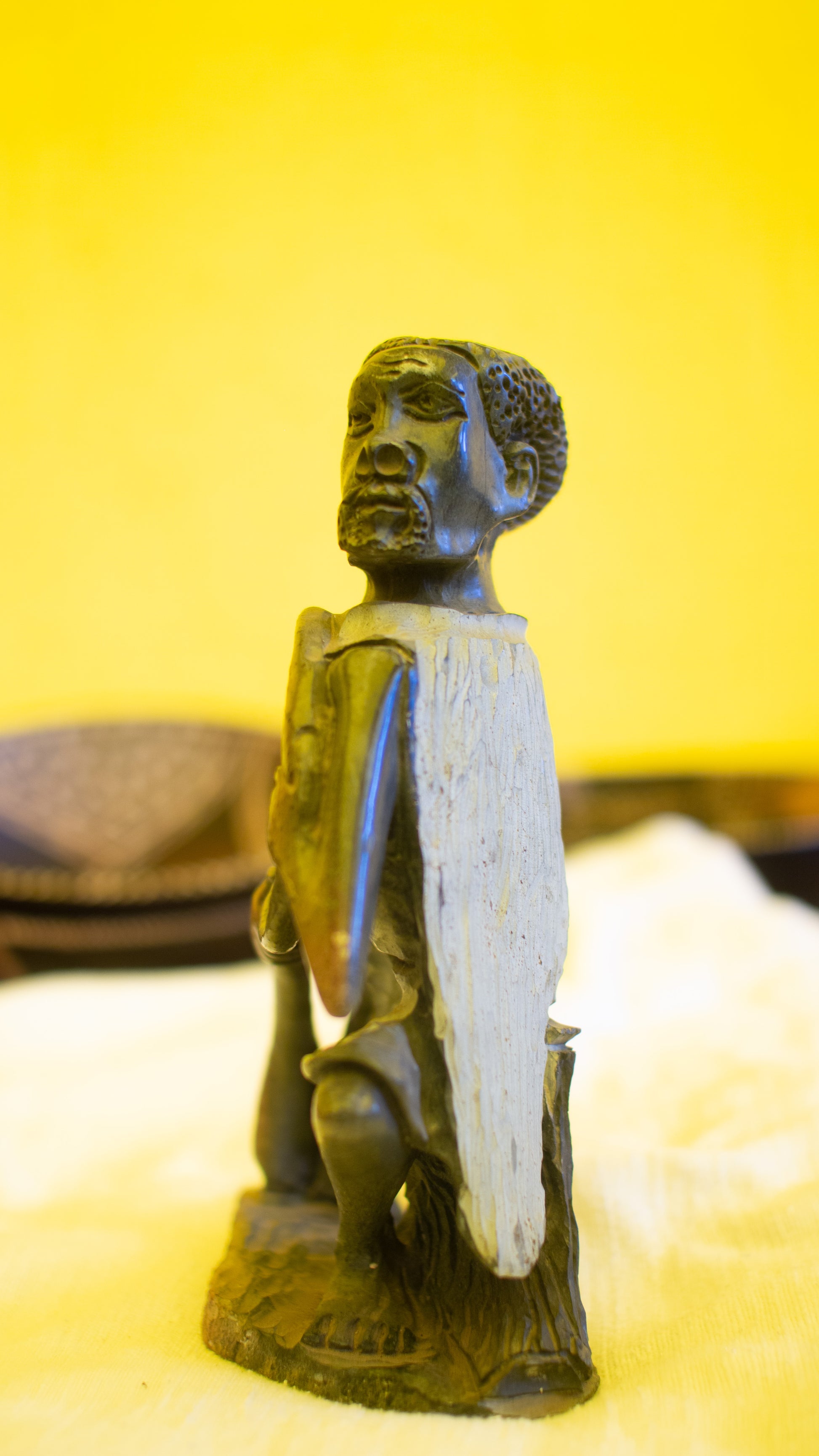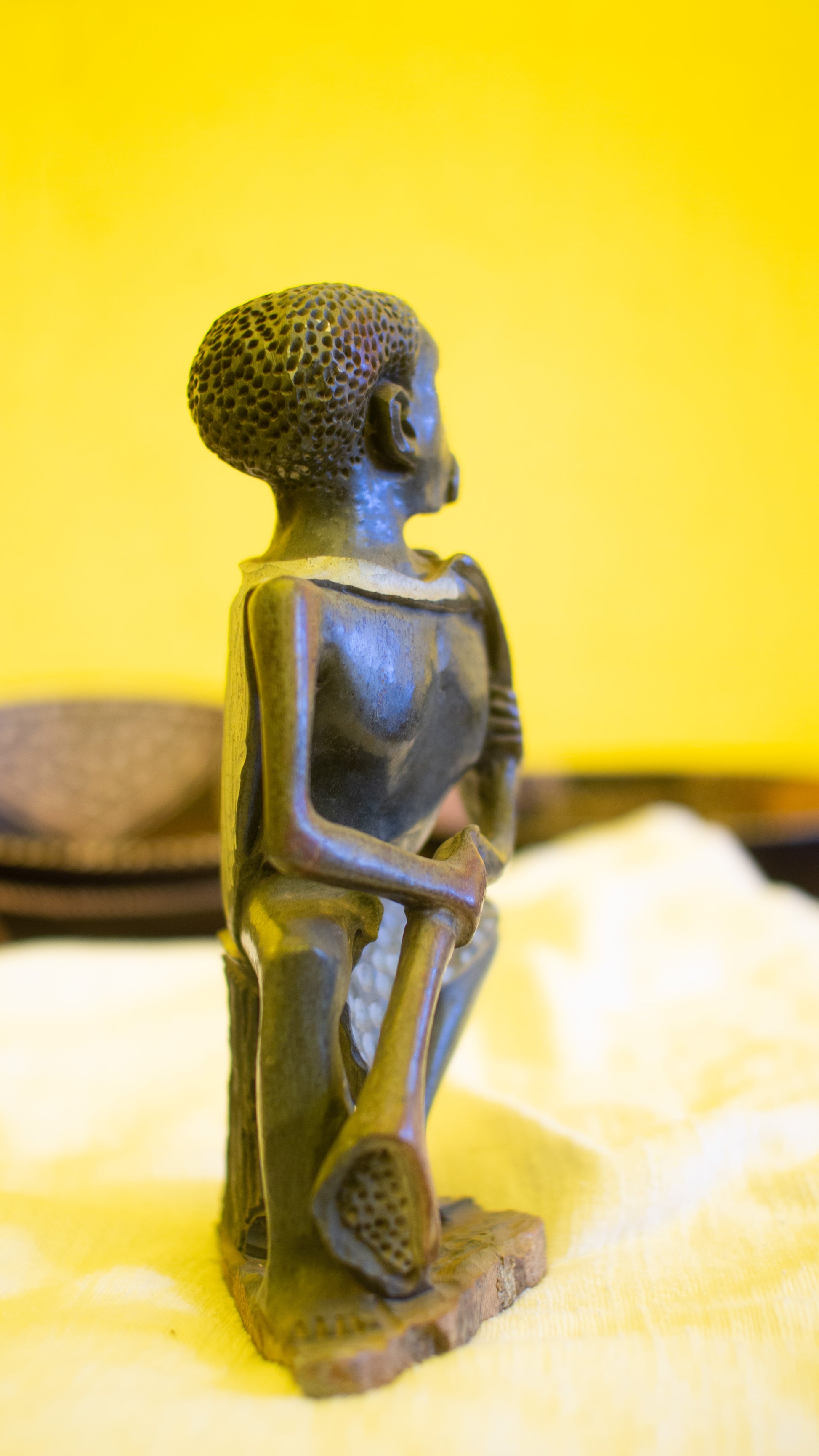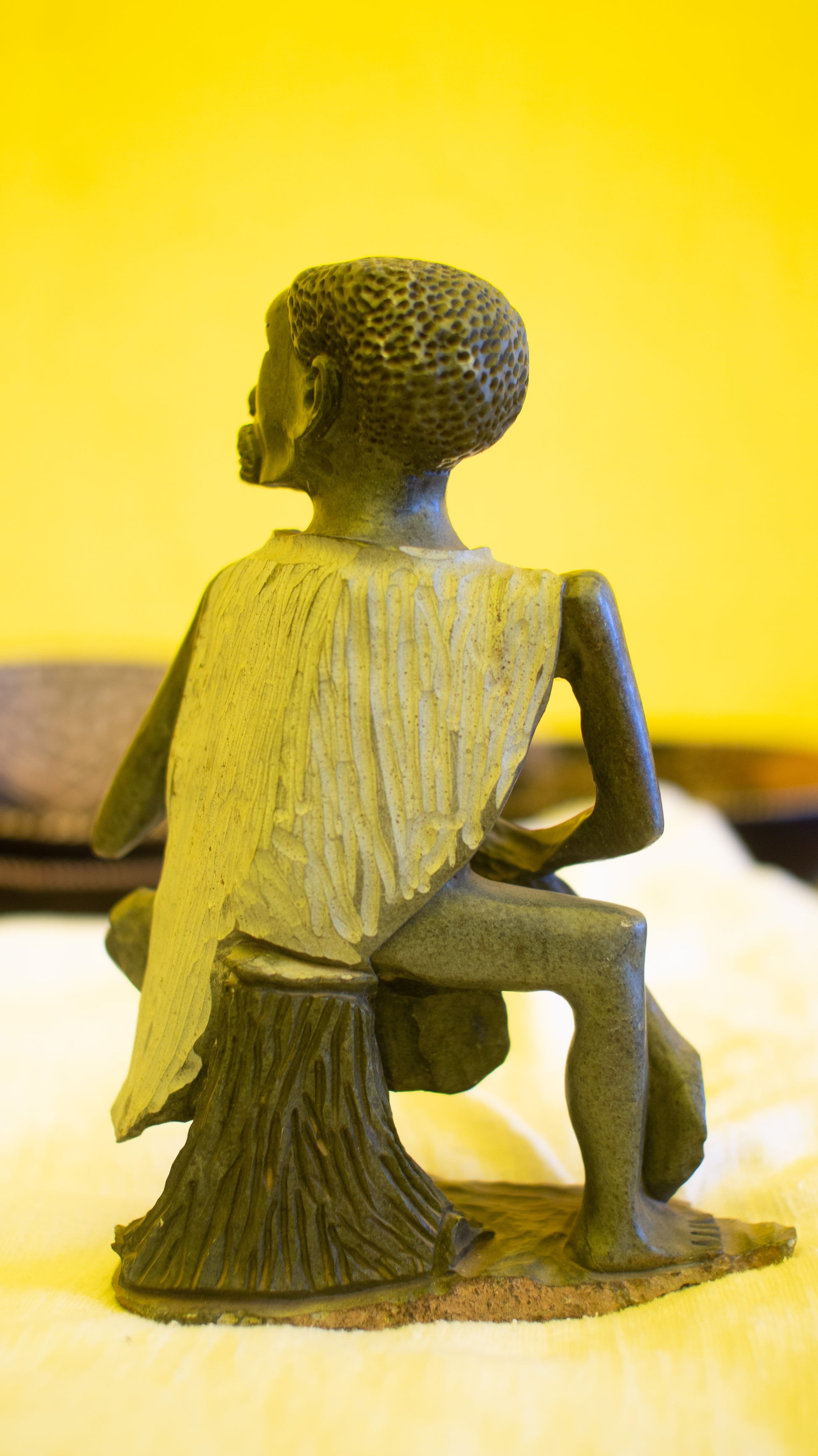Wise and grounded, this hand-carved stone sculpture portrays an elder seated with a cane and traditional cape, symbolizing knowledge, rest, and ancestral presence. The figure’s posture conveys humility and dignity, making this a meaningful addition to any art space or cultural collection.
