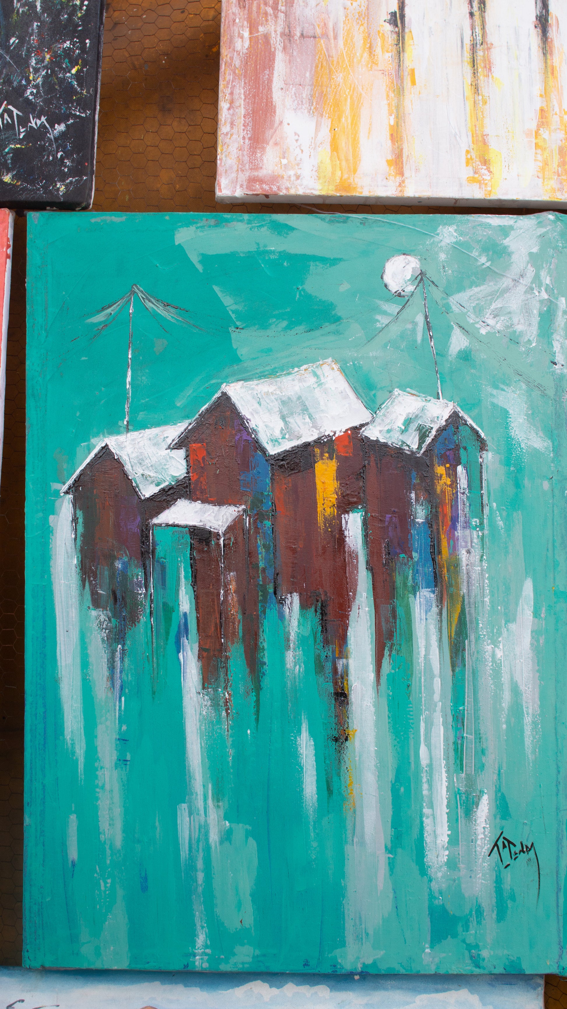 A stylised painting of houses where the lower halves dissolve into expressive, textured brushstrokes of fog. The scene sits against a smooth, plain blue background, creating a striking contrast between the structured forms of the homes and the fluidity of the painted base.