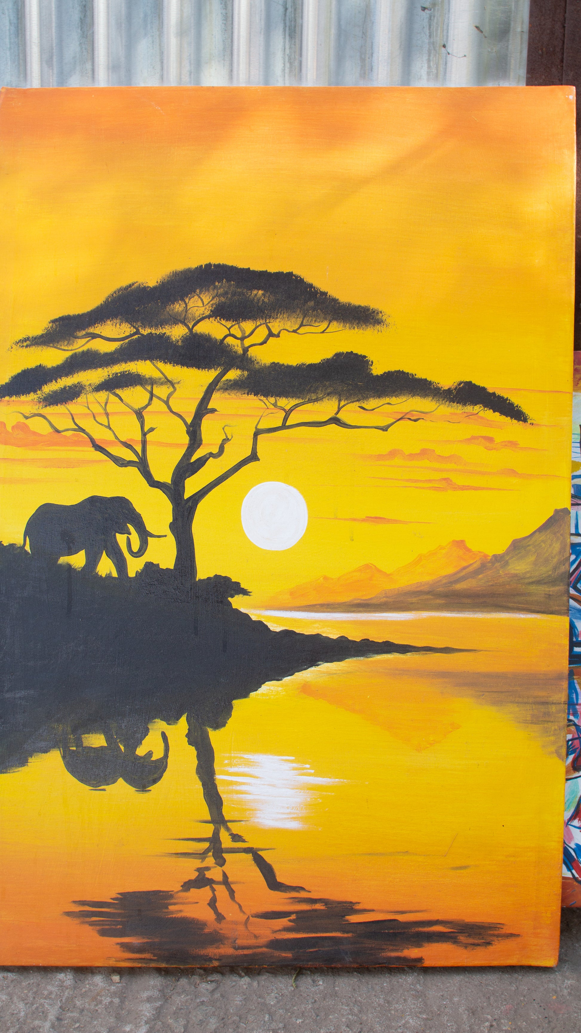 Savannah Sunset is a tranquil tribute to the natural beauty of the African landscape at golden hour. Painted in rich hues of yellow, orange, and warm amber, this silhouette-style artwork features the outlines of a solitary elephant, acacia tree, and distant mountains all backlit by a glowing full sun sinking into the horizon. The minimalist black forms contrast against the radiant sky with reflections in the water, creating a sense of peace, stillness, and timeless wonder.
